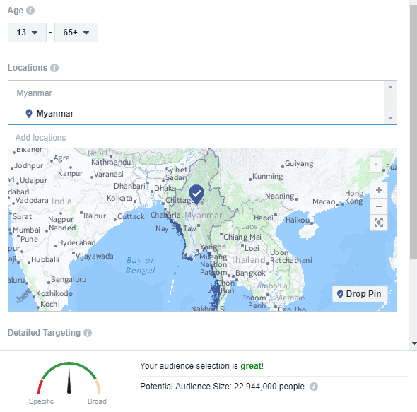 By selecting an audience “Myanmar nationwide between 13 and 65 year old”, we end up with an estimate target size of 22,944,000 users.