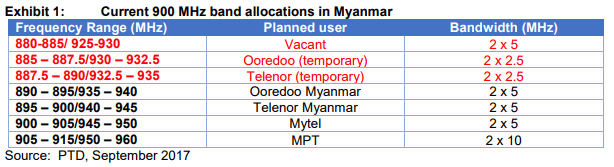 At the current stage of allocation, Ooredoo, Telenor and Mytel own respectively 2x5Mhz where MPT owns 2x10Mhz.